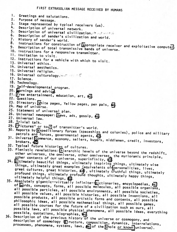Finally, toward the end of the list, item #35—in a style I have never encountered from any other writer, and to such a remarkable extent I feel these tendencies must inevitably be viewed as nothing less than going full-on Gunkel—the maestro himself returns, unavoidably, to his obsession with all possible ideas by imagining that the first message aliens send to humanity might include: